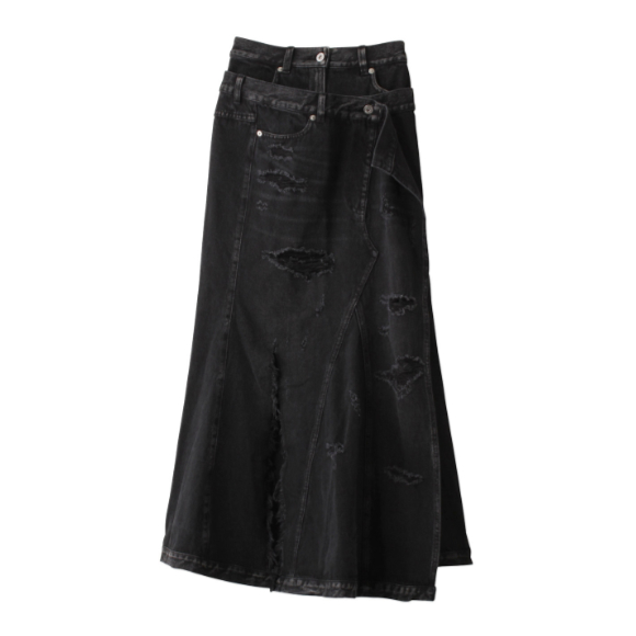 クラッシュ加工とマーメイドのシルエットで女性らしさとグランジ感を併せ持たせたデニムスカート。 深いスリットでロングブーツとの相性も抜群。中にミニスカートのように生地があるので、安心して着用可能。