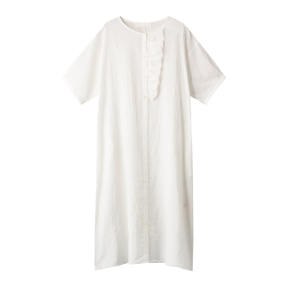 前立てのフリル端にピコ刺しゅうを施し、軽やかに仕上げたワンピース。ボタンはマットに艶消しをした、天然の高瀬貝を使用。リネンコットン平織素材で、暑い夏でも涼しく快適な着心地に。着ごこちはとても軽く、素肌をさらりとやわらかく撫でる感触が心地よい一枚。トルソー着用はホワイト Mサイズ。