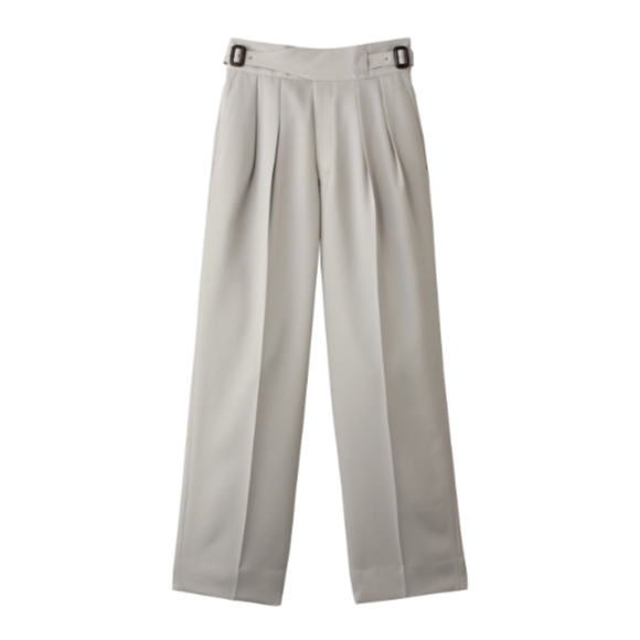 イギリス軍のグルカパンツをベースに、モダンな雰囲気にブラッシュアップした1着。ウール100%仕立ての上品なハリ感と計算されたウエストタックがきれいなワイドシルエットをメイク。ウエストベルトのバックルがアクセントを効かせ、旬のトップスインもバッチリ決まる。トルソー着用はすべてブラック46サイズトップグレー、サンドストーン48サイズ。