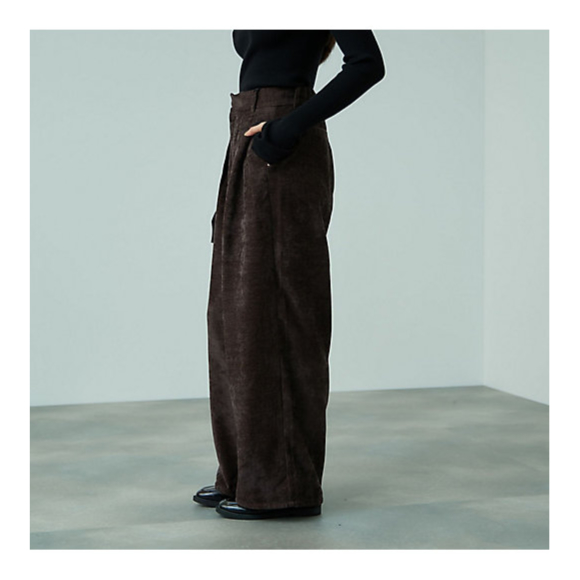 広めにとったインタックデザインのワイドシルエットなので、コンパクトなトップスをタックインしたスタイルやクロップド丈のブラウスなどとあわせたコーディネートが好バランスでご着用いただけ、おすすめです。