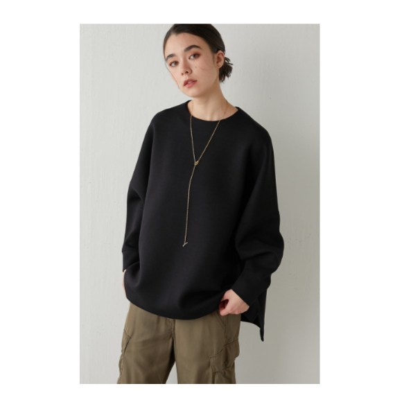 ふんわりとした肌触りが心地よいダンボール素材のトップス。ゆとりのあるスリーブやオーバーシルエットのストレスフリーな着心地が魅力。程よくハリのある風合いが立体感のあるシルエットをキープし、体型カバーにも◎。やや前後差のある着丈がバランス良く見せ、サイドスリットでさらに抜け感をプラス。袖をたくし上げてボリュームを出しても様になり、カジュアル過ぎない雰囲気が大人のスタイリングに馴染むアイテム。